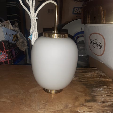 Mellemstor Kina Pendel designet af Bent Karlby og produceret hos LYFA. Glasdelen måler ca. 31 cm. i højde. Intakt med bundglas og monteret med lang hvid stofledning. Kan også leveres med top og bund i massiv teak. Ingen skader i glasset. Kan sendes mod at køber betaler porto.