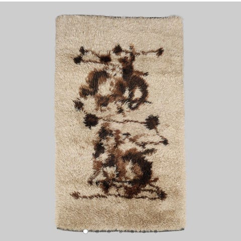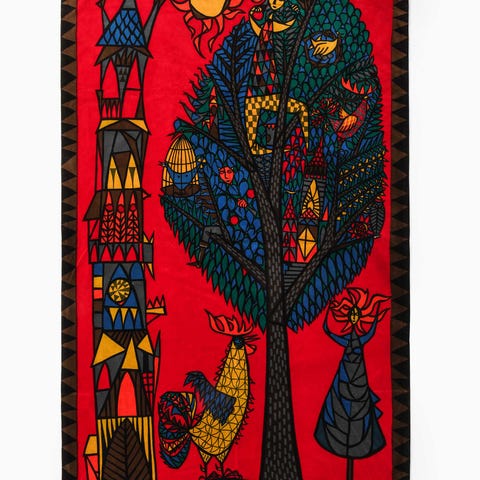 Designet af Erik Lundberg og produceret af Vävaregården i Sverige i 1950'erne. Designet præsenterer et dristigt og abstrakt udtryk for midtårhundredets skandinaviske tekstilkunst, kendetegnet ved et pixeleret eller tesselleret centralt motiv gengivet i okker, brændt orange, hvid, beige, mørkebrun og sorte toner.