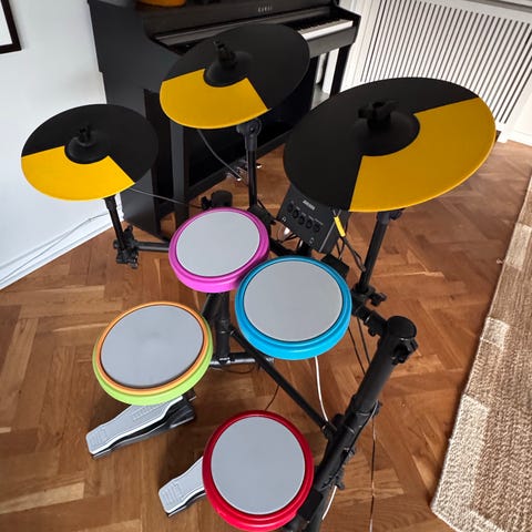 Elektronisk trommesæt med bækkener og dobbeltpedal