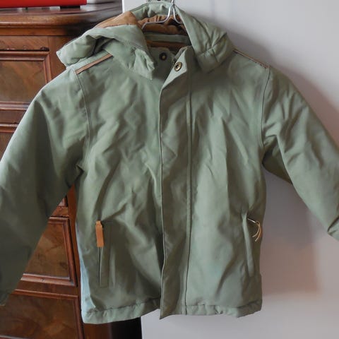 Lækker børnejakke med dinosaurprint fra Lil'Atelier. Vandtæt, varm og nem at rengøre. Hætten kan tages af. Brugt én sæson og er i rigtig god stand.