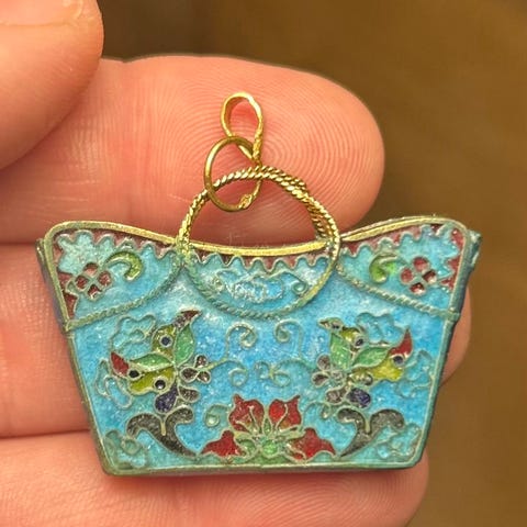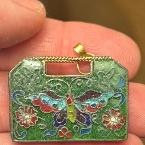Vintage cloisonné vedhæng – mini taske med sommerfugl