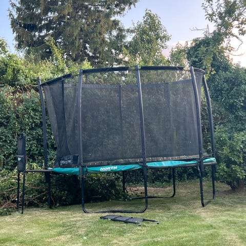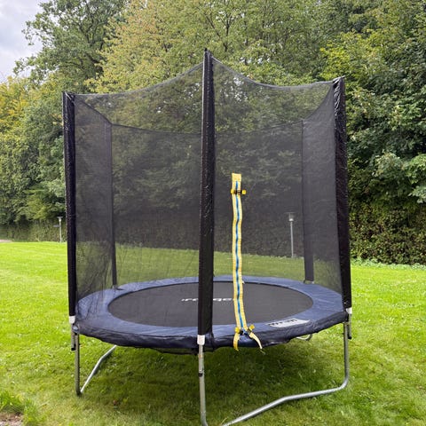 Dejlig stor trampolin, med Extreme stel for stabilitet og forankring.
