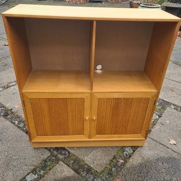 Reol i finéret eg med underskab og hessian beklædt bagbeklædning. Ydført hos HG Funiture i 1970'erne. Fremstår pæn og velholdt uden de store brugsspor.