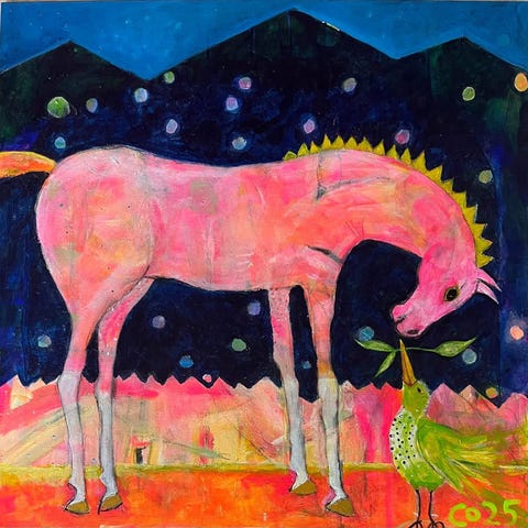 Unikt maleri med motiv af en rød hest med sko, på lyserød baggrund. Indrammet i en gylden special lavet ramme. Kunstværk til vægdekoration, mål 24 cm x 19,5 cm. Sender gerne.