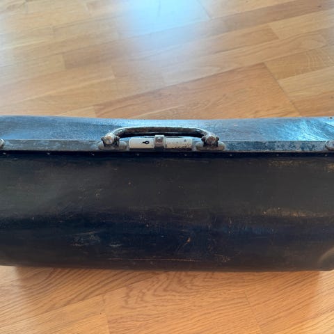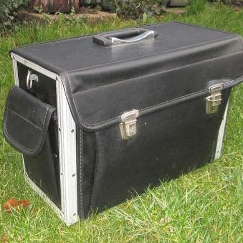 Dokumentmappe eller gammel skoletaske fra 1987. Med 2 indvendige rum. Læder i god stand. Lidt rust på spænder. Brede 37cm højde 33cm dybde 7cm