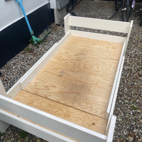 IKEA Juniorseng børneseng i hvidt træmateriale. Sengen har en størrelse, der passer til børn, og er designet til at give en passende soveløsning til børn. Sengen har en enkel konstruktion med en madras inkluderet. Bemærk, at der er mindre brugsspor på sengen, herunder nogle afskalninger i malingen på siderne.