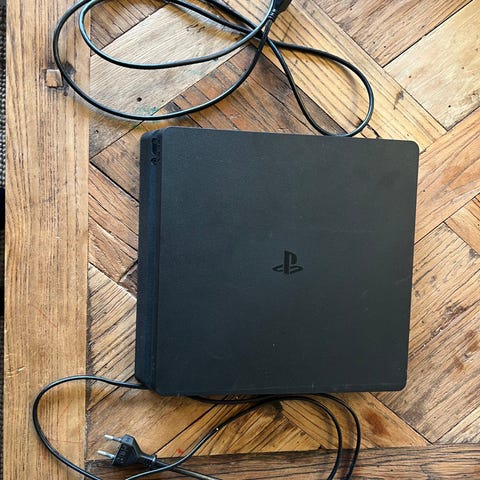 Sony Playstation 4 spillekonsol med tilhørende controller og kabler.