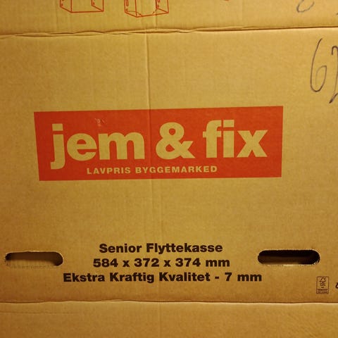 Kraftige Senior flyttekasser fra jem&fix sælges 10 kr. per stk. Kun brugt en gang.