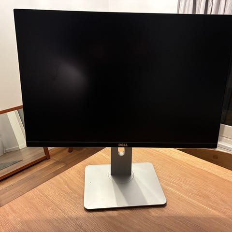 Dell 24 tommer skærm med justerbart stativ. Skærmen har en sort ramme og sølvfarvet stander. Velegnet til kontorbrug og generel computerskærm.