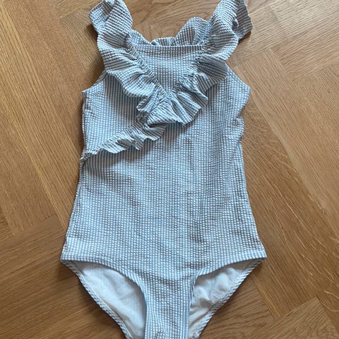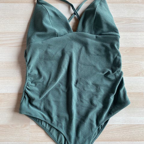 Helforet H&M badedragt med dyb V-udskæring med flæsekant, der fortsætter over skuldrene. Rynkning under brystet og i siderne, som giver optimal pasform over maven. Medium dækkende bagpå.