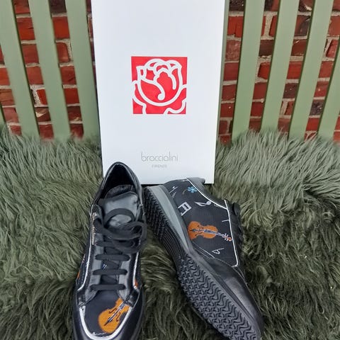 Smukke sneakers fra det Italienske kvalitetesmærke Braccialini str. 37 Sorte sko med brune pindsvin med sølvstænk. Kan bruges af både piger og drenge og voksne kvinder.