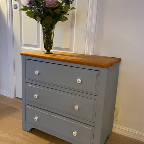 Den fineste kommode med velkørende og dybe skuffer uden lugt. Malet i en smuk denim lys blå farve. Se også mine andre møbler her på dba og Shila’s vintage møbler på Facebook