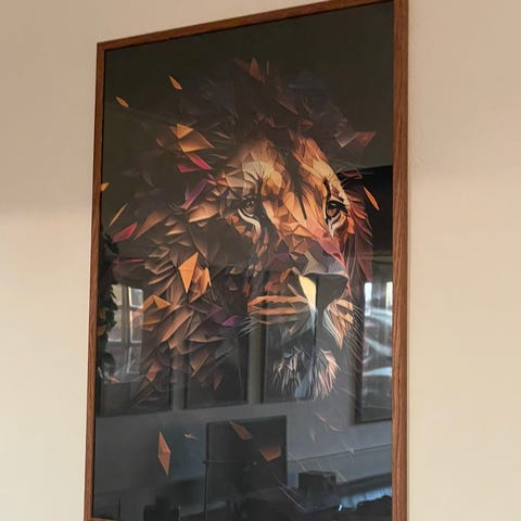 Fotoplakat af løve inkl ramme med akrylglas og sølvkant str 70x100.