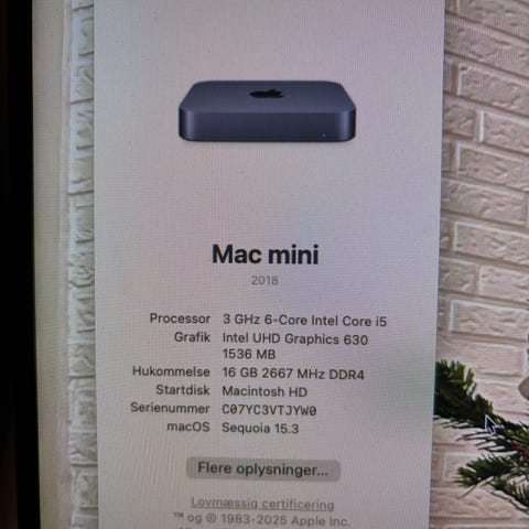 Apple Mac mini desktop med 3,2 GHz 6-core Intel Core i7 processor, Intel UHD Graphics 630, 64 GB DDR4 hukommelse og 1 TB SSD lagerplads. Enheden kører macOS og har Thunderbolt-porte til tilslutning af eksternt udstyr.