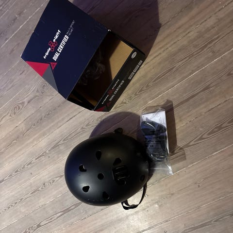 Triple eight cykelhjelm der er lidt klistret efter klistermærker men fint fungerende.