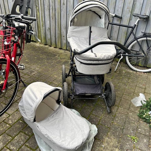 Odder barnevogn i sort med lilla aftegning plus liggedel til.