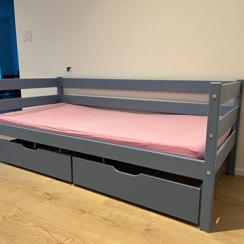 Børne juniorseng med 2 stk praktiske opbevarings skuffer