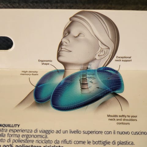 Rejsepude for behagelig nakkestilling, der kan foldes sammen til en pølle som man kan have bag lænden under rejsen. Aldrig brugt