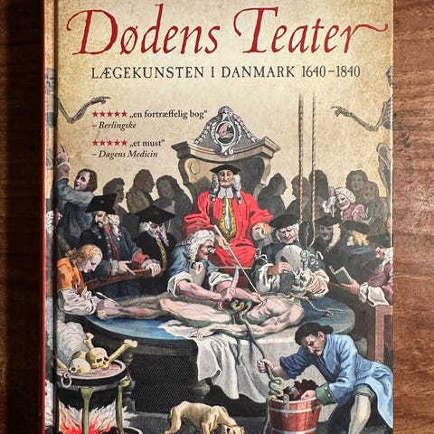 Klaus Larsen Dødens Teater bog om lægekunsten i Danmark 1620-1840. Indeholder historisk information og illustrationer relateret til medicinsk praksis i perioden.