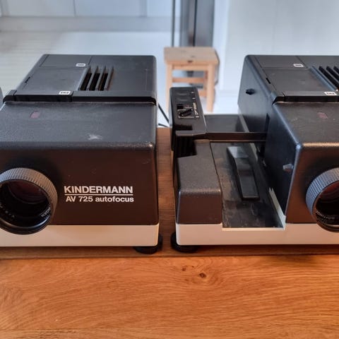 Rollei 3000 diaprojektor med justerbar linse og tilslutningskabel. Enheden er designet til visning af dias og har en robust konstruktion.