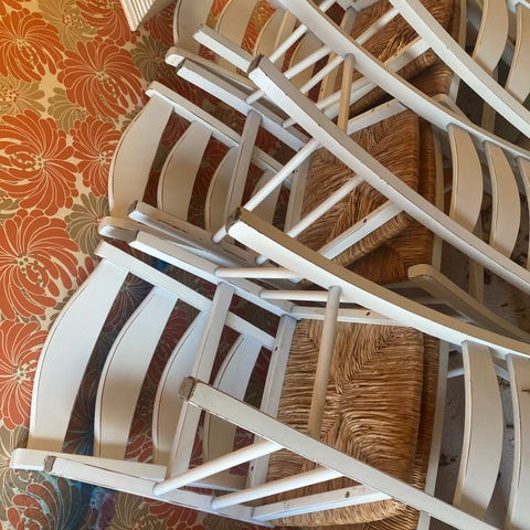 Sæde skal ombetrækkes, sorte, man sidder godt i dem, sæder er skruet fast med 2 skruer såde kan afmonteres, stolene er pæne og fine bortset fra sæderne