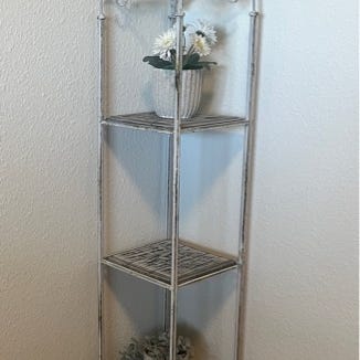 Charmerende lille metalreol med flettede hylder – de kan slås op og ned individuelt for at regulere pladsen – til fx blomster. 75 cm høj – 30x15 – det ene hjørne er bøjet lidt – kan nemt rettes ud – har alderssvarende patinalle metalreol med flettede hylder