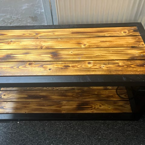 Dejligt TV-bord med påmonterede krydsfinerplader der har en dejlig mørk og var patina-glød.