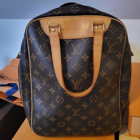 Brun Louis Vuitton taske med justerbar rem og to rum med lynlås. Tasken har læderdetaljer på hjørnerne og ved remmen. Indvendigt er der et brunt for.
