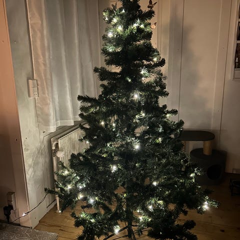 Bord juletræ ca. 70 cm højt op til stjernen, sælges med pynt og lys.