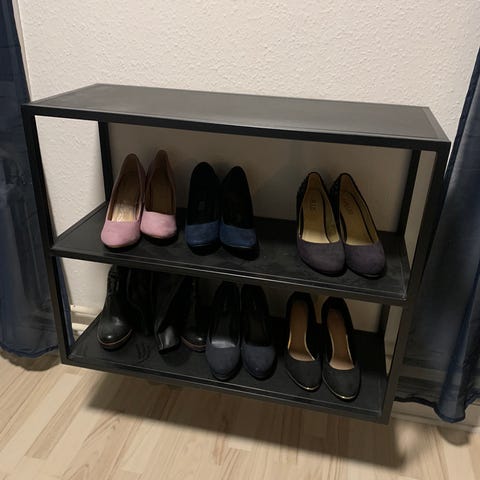 Flot og let reol. Hviler op mod væggen. Kan spændes fast til væggen med usynlig strop.