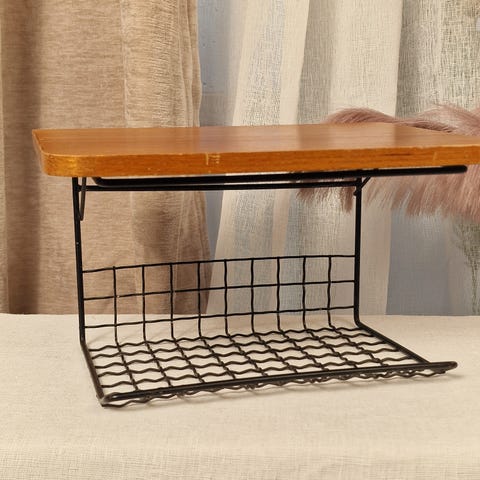 Retro telefonhylde / natbord eller væghylde i teak med en lille skuffe og magasinholder.