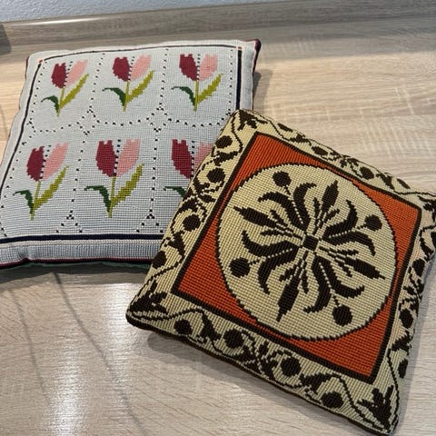 Vintage pude broderet med uld på uldjava. Det velkendte motiv med mælkebøtter, sandsynligvis fra Permin. Puden måler ca 38x41