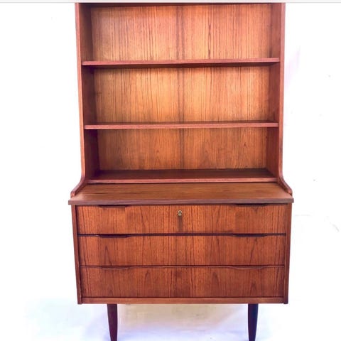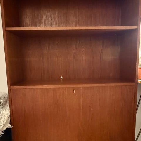 Teak Bogreol / chartol fra 1960’erne med udtræksplade til skrivebord. I fin stand, men med få spor af brug. Nøgle til skuffer følger med. Stemplet Dess Nr 51 (Korinth møbelfabrik).