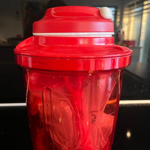 Tupperware drikkedunk i rød plast med hvid låg og drikketud.