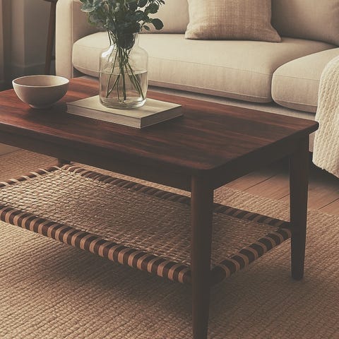 SOFABORD, teak med rattan bundhylde.