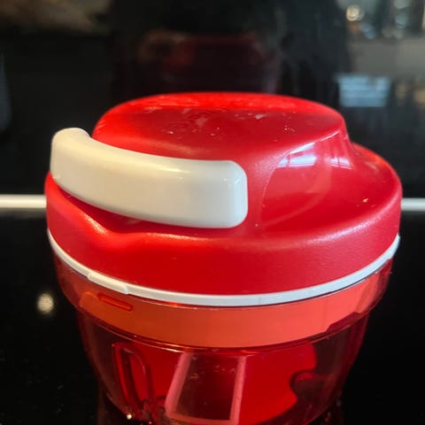 Rød blenderflaske i plastmateriale med låg og drikketud. Velegnet til blanding af shakes og drikkevarer.