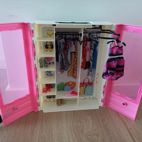 Barbie legetøj bestående af en lille indkøbsvogn med lyserøde hjul og en orange kurv. Legetøjet er designet til børn og kan bruges til rolleleg og udvikling af motoriske færdigheder.