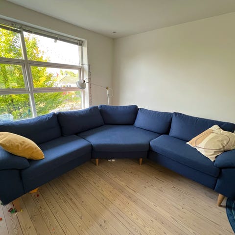 Blå stof hjørnesofa med rummelig siddeplads og polstrede armlæn. Sofaen har en moderne og enkelt design, der passer til forskellige boligindretninger. Materialet er holdbart stof, som giver komfort og slidstyrke.