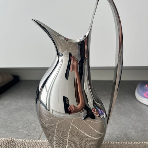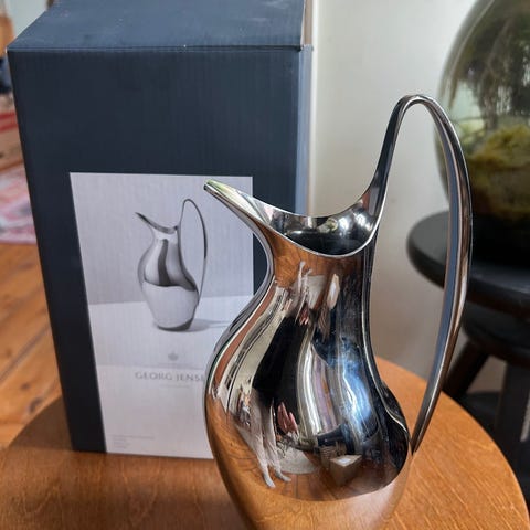 Georg Jensen Henning Koppel kande i sølvfarvet metal med elegant og tidløst design. Velegnet til servering af drikkevarer.