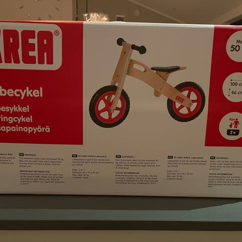 Krea Løbecykel i træ til børn med en maksimal belastning på 50 kg. Cyklen har et enkelt og robust design, der er egnet til små børn til at lære balance og koordination.