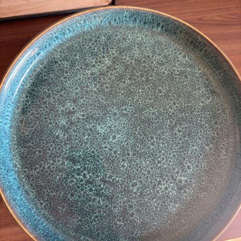 Bitz tallerkener i forskellige farver. De er sorte udenpå og farvet indeni. Det er middagstallerkener.