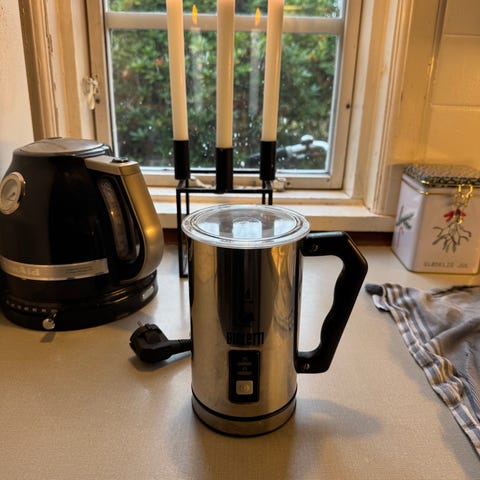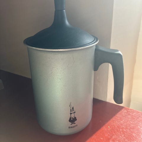Bialetti Tuttocrema kaffeskummer med en kapacitet på 1 liter. Fremstillet i sølvfarvet materiale med sort håndtag og låg. Designet til at skumme mælk til kaffe og andre varme drikke.