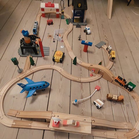 Stor BRIO togbane med Brio vognsæt et af dem er selvkørende Sættet består ellers af: Brio Hejselift hus, Brio Færge, Brio hejselift skinne, Brio Metro stoppested, Brio Bjerg bro/tunnel, Brio træer, dyr og mennesker, Bondehus, Rød bro samt div andre ting. Der er forskellige skinner, nye og ældre: buede, lige og sporskifte skinner i træ. Alt på billederne medfølger, og er pakket i en pose. Sættet kan sammensættes til mange forskellige baner. Det er primært træ og plastik. Egnet til børn til leg og udvikling af motoriske færdigheder.