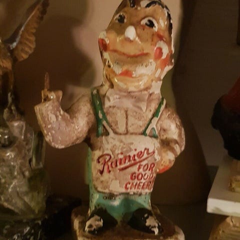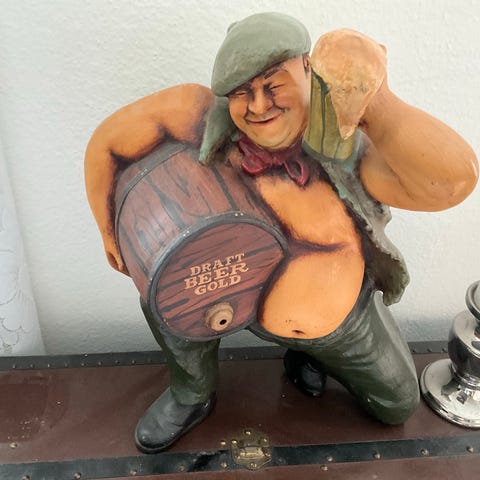 Ølmand, Tuborg mand, den tørstige mand. Bronze figur 12 cm. Nålepude med nipsenåle i tønden.
