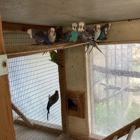 Billeder viser flere undulater i forskellige farver, herunder blå, grøn og grå. Fuglene er placeret i et bur med træpinde til siddepladser. Undulaterne har karakteristiske sorte og hvide mønstre på hoved og krop.