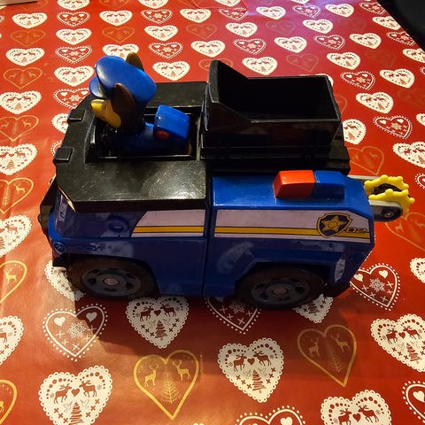 Chase Safari-bil med mulighed for affyring. Affyring virker. Kølerhjem/grill kan køres ned. Hjulkapsel på det ene hjul mangler, men den kører perfekt. Chase safari-figur medfølger.