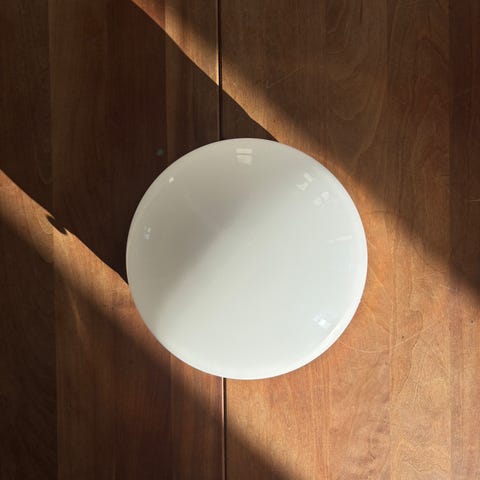 Vintage Murano plafond lampe i hvidt opalglas med rødt, gult og blåt mønster og lampen kommer med et patineret hvidt ophæng.