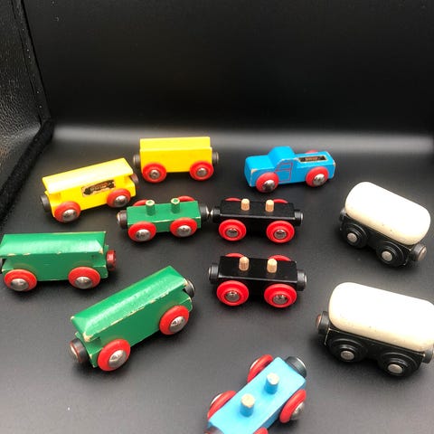 BRIO Togbane sæt i træ med flere skinner, tog, broer, tunneller og tilbehør. Sættet indeholder forskellige former for skinner, herunder lige og buede, samt flere tog og figurer. Materialet er træ og plastik med farver i sort, rød, grøn og naturtræ. Har været brugt gennem årtier, men har mange gode år og oplevelser til gode endnu