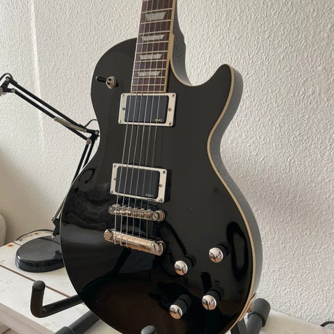 Sælger dette smukke instrument. Der er tale om Epiphone Standard, som er den helt fine afdeling af Epiphone. Træet, materialer, finish og spilbarhed er i top på disse modeller. Den er bygget om med en masse dele, der sidder nye strenge på og så er den blevet justeret. En stor opgradering er pickupperne. Det er aktive pickupper, så de er nemme at styre, støjer minimalt og så er der masser af output. Samme opsætning bruges af Metallica, Zakk Wylde etc.