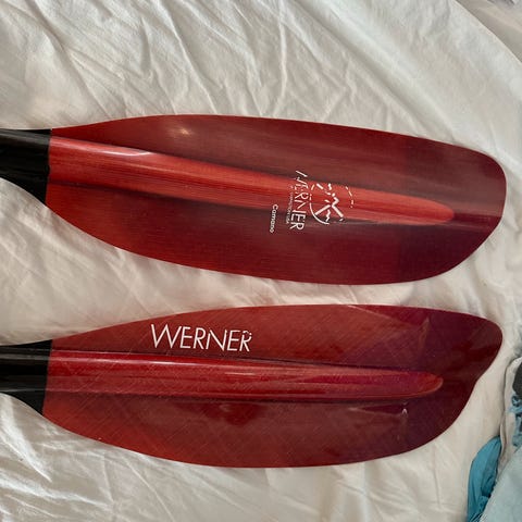 En lækker kvalitetspagaj fra Werner. Den er 2-delt og med lige kulfiberskaft. Bladene er i glasfiber.